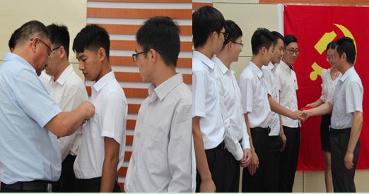 学院党委书记林艳书同志带领新党员面对鲜红的党旗,紧握右拳,以饱满的精神状态、洪亮的声音进行庄严的入党宣誓。表明他们为党和国家奋斗终身的坚定决心和对中国共产党忠贞不渝的革命热情。之后,林艳书书记和王敏达副书记为新党员佩带党徽,这代表着他们有了一个光荣的身份——