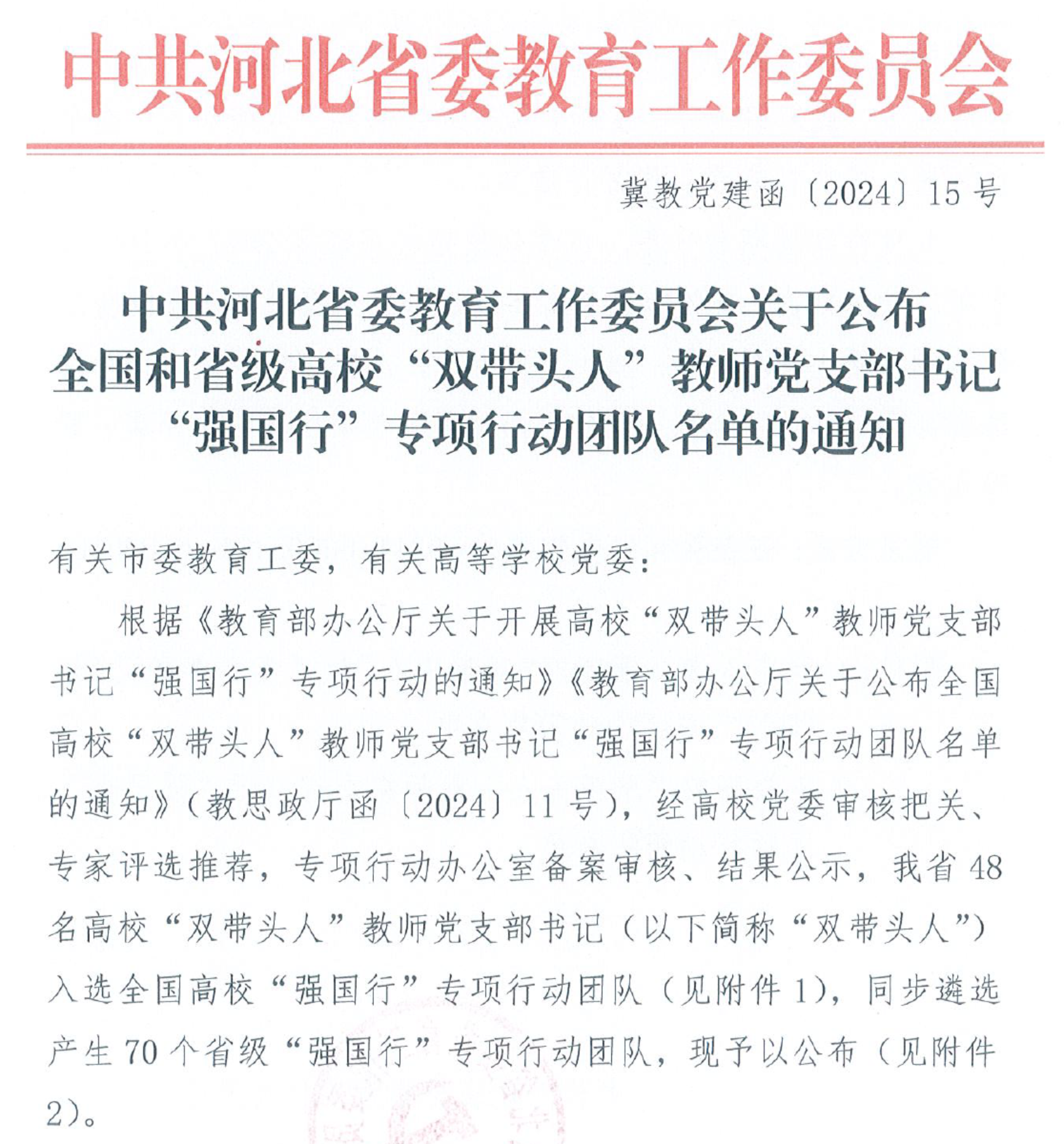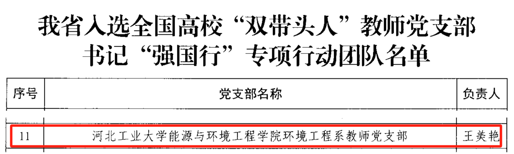 近日,教育部办公厅和河北省委教育工作委员会发布了《关于全国高校“双带头人”教师党支部书记“强国行”专项行动团队名单的通知》,探花系列 探花系列 环境工程系教师党支部成功入选全国高校“双带头人”教师党支部书记“强国行”专项行动团队。