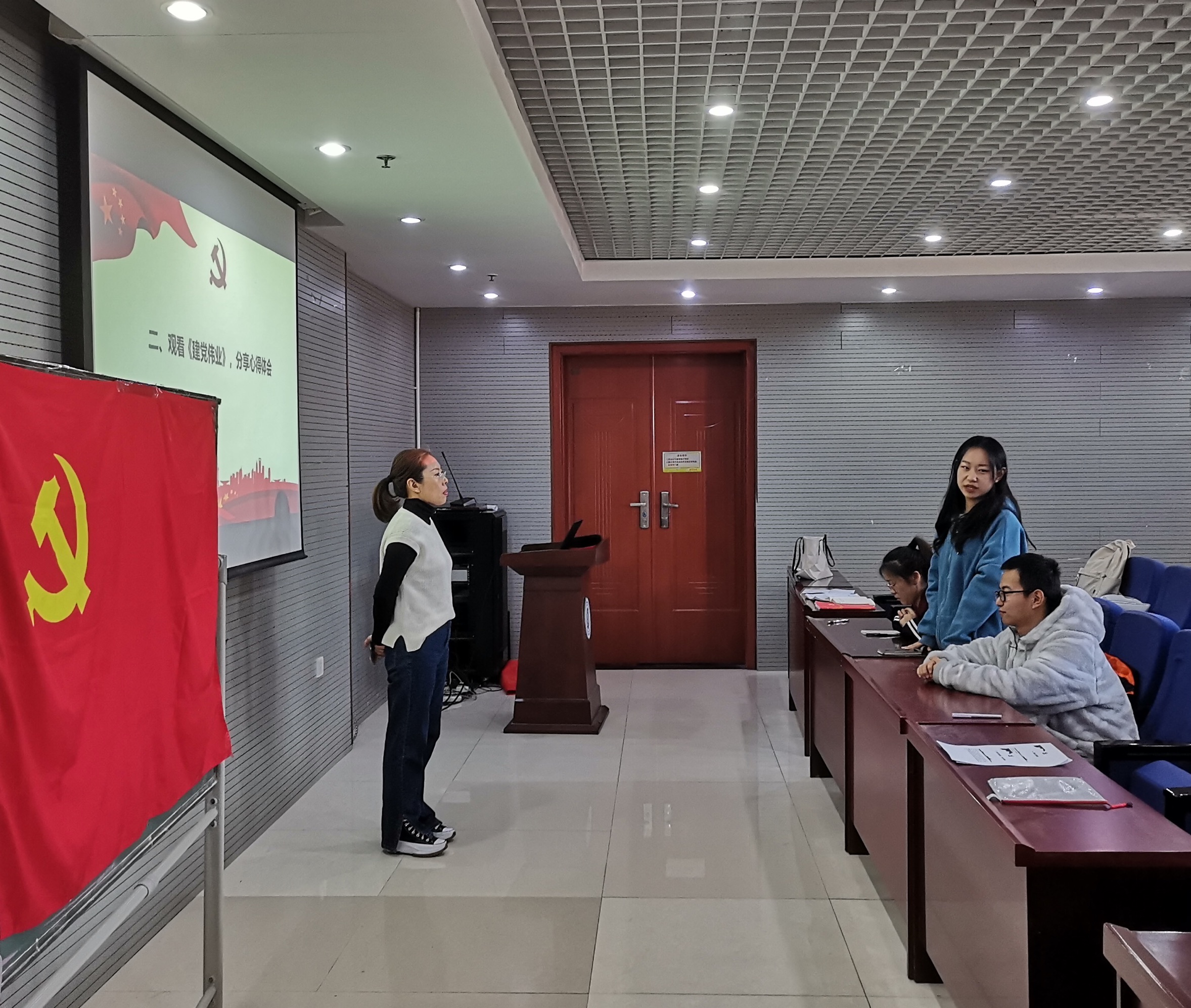 首先,支部书记赵艺茵同志带领大家重温入党誓词,再次表明我们作为新时代青年准备随时为党和人民牺牲一切的理想信念和坚定决心。