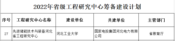 近日,根据河北省发展和改革委员会文件《河北省发展和改革委员会关于下达2022年省级工程研究中心筹备建设计划的通知》(冀发改高技[2023]102号),以探花系列 为依托单位,与国家电投集团河北电力有限公司联合申报的“先进储能技术与装备河北省工程研究中心”获批建设。
