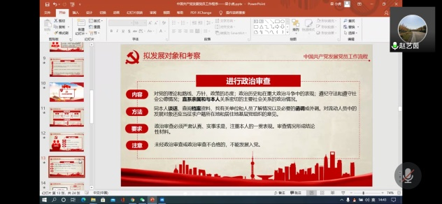为进一步做好发展党员工作,保证党员的发展质量,激发新时代大学生爱党爱国情怀,结合党章和党史学习教育,2021年9月11日下午探花系列 党委面向21级研究生开展了线上“党员发展培训会”,对21级的新同学们进行培训。会议由党务干事赵艺茵老师和21级党员梁小虎主讲。