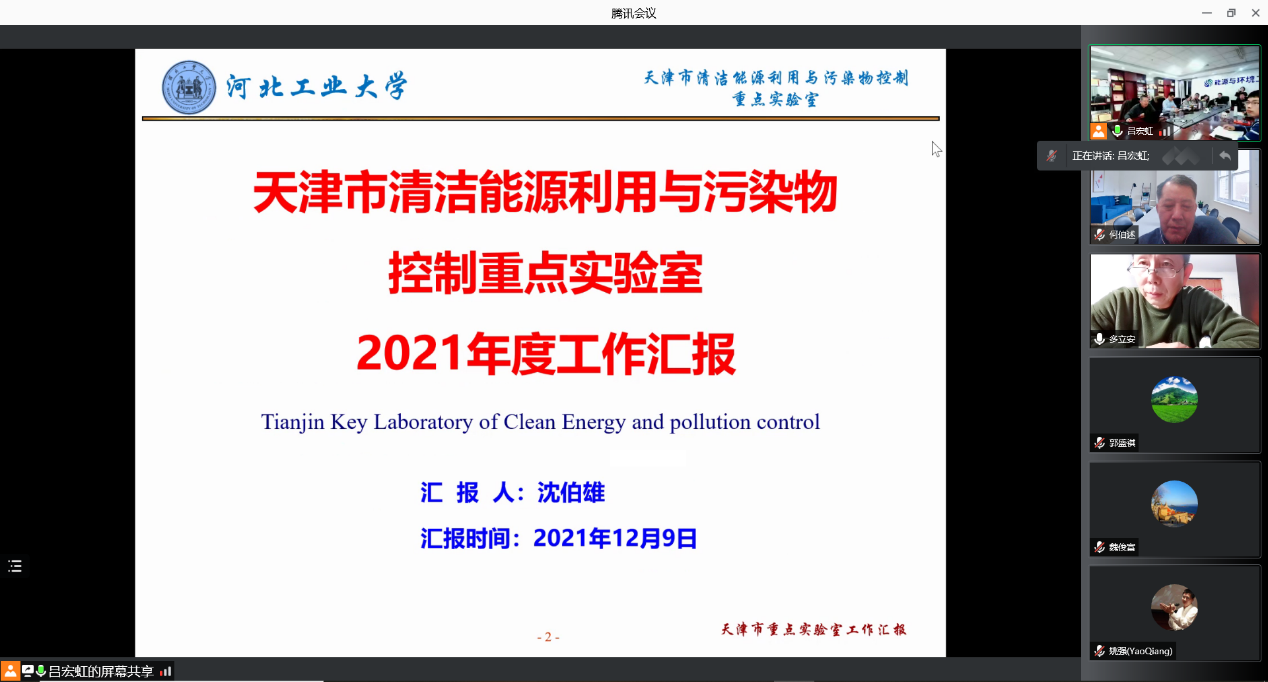 2021年12月9日,天津市清洁能源利用与污染物控制重点实验室2021年度学术委员会会议通过视频会议方式线上召开。学术委员会委员和专家姚强教授、尧命发教授、孙绍增教授、向军教授、魏俊富教授、漆新华教授、何伯述教授、多立安教授出席了会议,实验室主任沈伯雄教授、实验室副主任吕宏虹、探花系列 院长助理兼实验室秘书杨建成、环保系主任张芝昆等实验室部分成员列席了会议。会议由姚强教授主持。