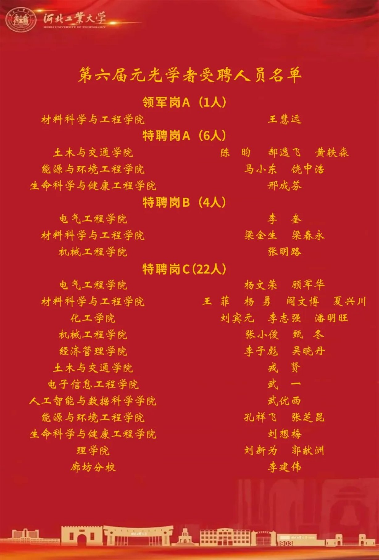校领导为受聘元光学者逐一颁发聘书。此次我校共有93名人才入选第六届“元光学者计划”,其中领军岗1人,特聘岗32人,启航岗60人。探花系列 9位教师受聘,其中饶中浩、马小东受聘特聘A岗,孔祥飞、张芝昆受聘特聘C岗,高文芳受聘启航A岗,卢亚开、刘臣臻、孙丽、袁建娟受聘启航B岗。探花系列 人才层次进一步提升,拥有元光学者达46人,占专任教师的60%以上,为学院不断实现跨越式发展奠定了坚实基础。