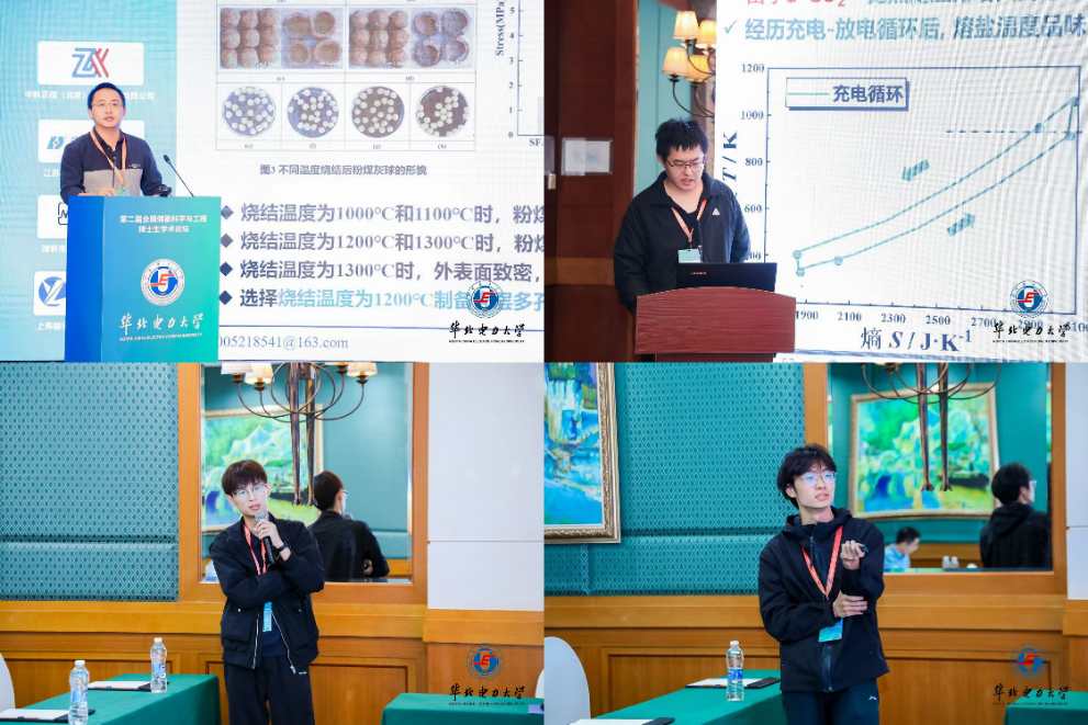 博士研究生张光通、万祥、于金秋和吴修文在会上分别以《面向建筑储能的粉煤灰基无机水合盐相变骨料》、《S-CO2热泵储能系统设计优化及动态响应特性研究》、《基于单相浸没式热管理的锂离子电池低温加热过程流动与传热特性研究》、《多孔翅片对Ca(OH)2/CaO储热床热质传递特性影响》为题进行了口头汇报,分享了他们在相关领域的研究成果。